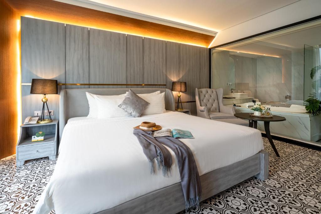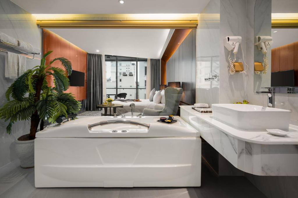 - Phòng Junior Ocean Suite có diện tích là 45m2 với thiết kế gồm một giường đôi với tầm nhìn trực tiếp ra hướng biển với các kiểu cách trang trí ấn tượng trong từng chi tiết mang đến du khách cảm giác mới lạ. Đặc biệt là bồn tắm nằm ở ngay khu vực phòng ngủ, quý khách có thể đắm mình ngay trong làn nước mát lạnh và ngắm nhìn cảnh biển xinh đẹp. Căn phòng này rất thích hợp dành cho những cặp đôi mới cưới và đi hưởng tuần trăng mật cùng nhau, chắc chắn sẽ là trải nghiệm thật ngọt ngào dành cho quý khách.