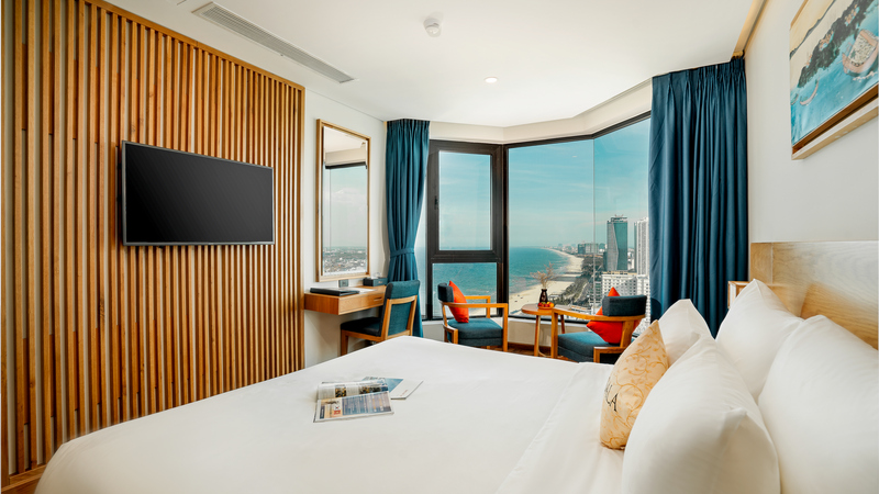 - Phòng Superior Double Partial Sea View có diện tích là 28m2, có 1 giường lớn phù hợp cho gia đình hay cặp vợ chồng. Phòng có cửa sổ kính lớn với hướng view nhìn ra một góc biển Mỹ Khê xinh đẹp.