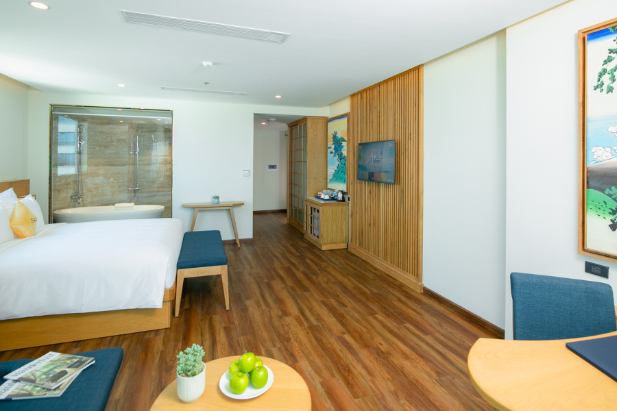 - Phòng Sala Suite được thiết kế với trần nhà và giường có hình tròn vô cùng hiện đại, lạ mắt. Phòng có 1 giường đôi, diện tích của phòng là 48m2, không gian rất thoải mái và rộng rãi để gia đình có thể thư giãn, nghỉ ngơi. Hướng nhìn từ ban công của phòng hướng ra biển nên sẽ là vị trí rất tuyệt vời để du khách có thể thoả thích ngắm nhìn bãi biển trong xanh và check-in lưu giữ những kỷ niệm đẹp tại thành phố Đà Nẵng.