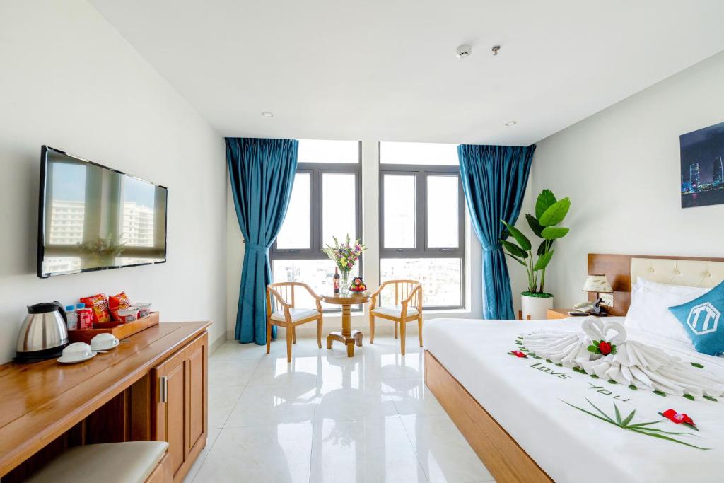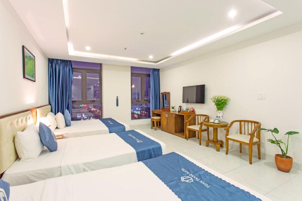 Khác với các phòng ba thông thường, Deluxe Triple tại Toàn Thắng có tới 2 giường đôi lớn (1m6 x 1m2), diện tích 30m² cùng cửa sổ rộng hướng thẳng ra biển và thành phố. Không gian thoáng đãng này đặc biệt phù hợp với khách quốc tế hoặc nhóm bạn trẻ cần sự riêng tư nhưng vẫn muốn ở cùng nhau. Mỗi sáng, bạn chỉ cần kéo rèm là cả đại dương như ùa vào căn phòng.