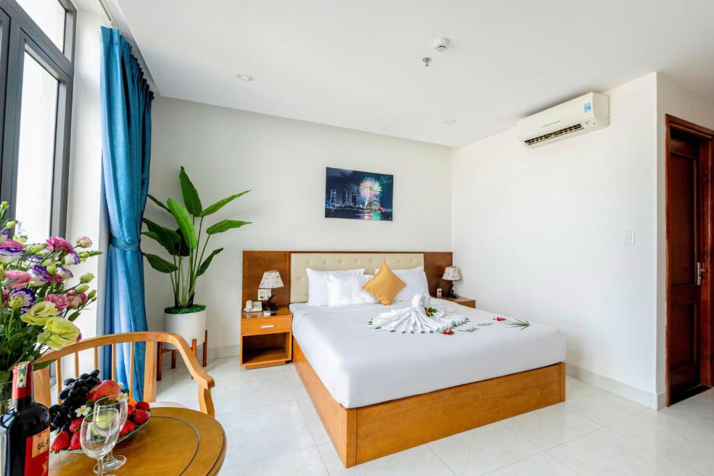 Không gian 30m² rộng rãi, đầy đủ tiện nghi với 1 giường đôi lớn (1m8 x 2m), cửa sổ lớn hướng xéo ra biển và thành phố – đó là điểm nhấn của hạng phòng Deluxe Double. Khi màn đêm buông xuống, từ ô cửa bạn có thể nhìn thấy ánh đèn lấp lánh từ các tòa nhà và nghe sóng biển rì rào như một bản nhạc ru giấc ngủ.