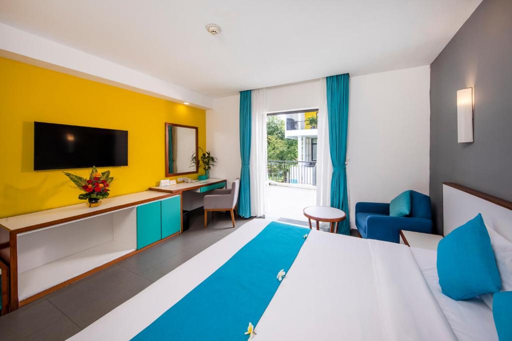 - Phòng Deluxe có diện tích là 29m2 với 2 sự lựa chọn dành cho du khách là loại phòng có view hướng thành phố hoặc view hướng hồ bơi. Phòng được thiết kế ban công rộng rãi để quý khách có thể ngắm cảnh bên ngoài. Hạng phòng này được bố trí 1 giường đôi hoặc 2 giường đơn phù hợp với nhu cầu của từng khách hàng.