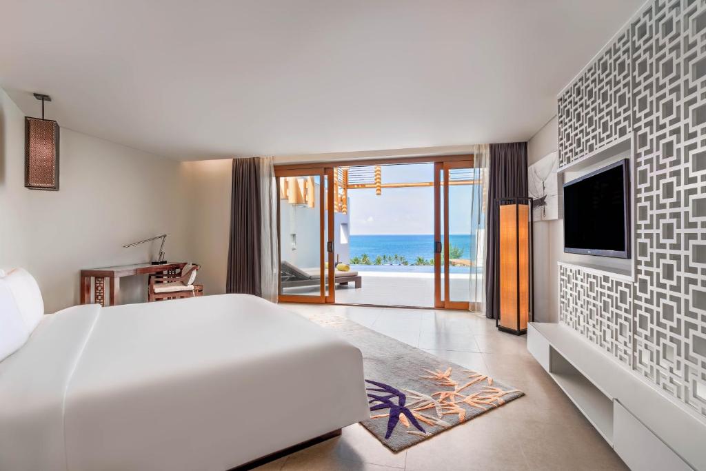 5. Beachfront One Bedroom Suite: Với tông màu trắng tinh khôi, chủ đạo cùng cách hiện đại, tỉ mỉ, căn phòng sở hữu không gian rộng 90-102m2 được bố trí gồm 1 phòng khách, 1 phòng ngủ và 1 hồ bơi riêng. Thêm vào đó, căn phòng còn được trang bị đầy đủ các tiện nghi đẳng cấp bao gồm: TV 42 inch với các kênh truyền hình cao cấp, tủ lạnh, đồ uống miễn phí, điều hòa, điện thoại, quầy bar mini, bồ tắm,…..