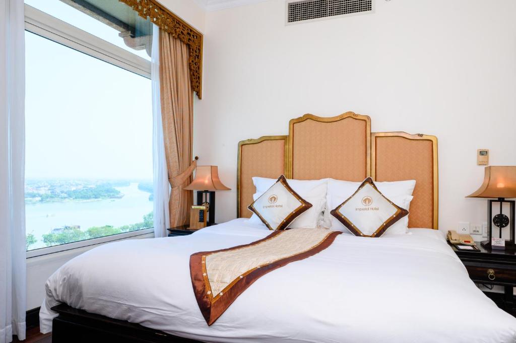 - Phòng Imperial Suite là một không gian nghỉ dưỡng đầy sang trọng dành cho du khách khi sử hữu vị trí tại tầng cao nhất tại khách sạn với ban công riêng và cửa sổ lớn hướng ra sông Hương. Du khách sẽ cảm thấy vô cùng thoải mái và hài lòng khi nghỉ ngơi tại căn phòng này bởi không gian rộng rãi và tiện nghi từ căn phòng mang lại.