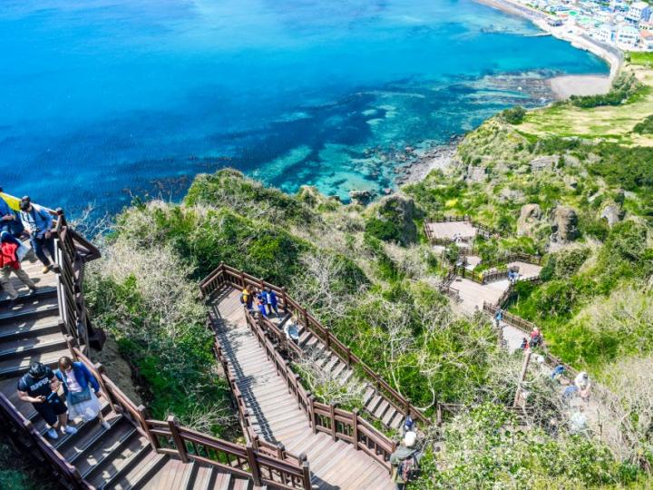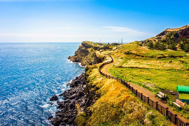 Đỉnh Seongsan Ilchubong: Đỉnh núi Seongsan nằm phía đông cuối đảo Jeju, thực chất là một ngọn núi lửa hoạt động cách đây 5 ngàn năm và đã tắt giờ đây nó được công nhận là di sản văn hoá thế giới năm 2007. Được mệnh danh là đỉnh Nhật Xuất (Sunrise Peak) bởi đây là nơi lý tưởng để ngắm mặt trời mọc và đón ánh bình minh. Hầu như tất cả du khách tới nơi đây đều mong muốn được một lần thử cảm giác đón ánh mặt trời của một ngày mới dâng lên trong yên bình từ miệng núi lửa tuyệt đẹp này.